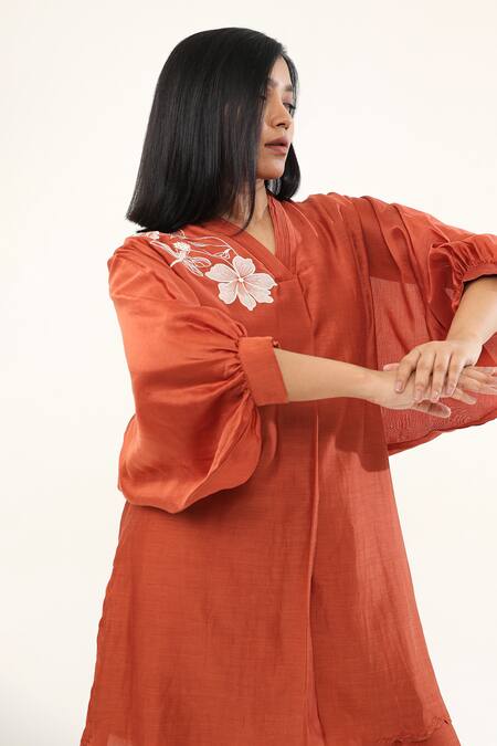 Rust orange kurta featuring dolman sleeves with blossom garden applique on the shoulder and back. Paired with matching pants that have scalloped edges.