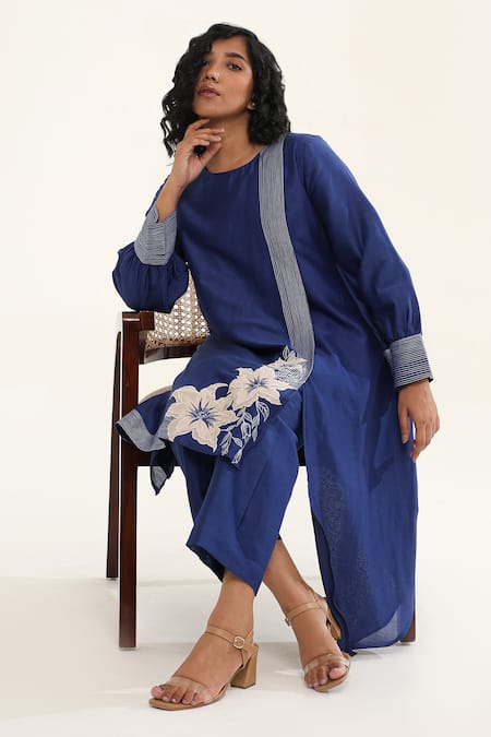Blue asymmetric kurta featuring puffed sleeves with daisy applique and thread embroidery. Paired with coordinating pants in Chanderi silk.