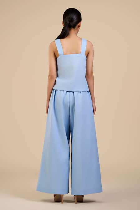 Blue Linen Blend Plain Flared Trouser