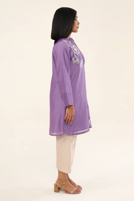 Purple Chanderi Silk, Cotton Applique Collared Flora Bloom Kurta With Pant