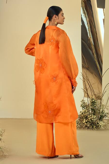 Orange Crepe Applique Sweetheart , Shawl Floral Shrug Pant Set