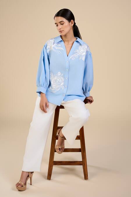 Floral thread embroidery on the front panel, Button-down closure with a relaxed silhouette