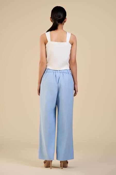 Blue linen blend trouser featuring side pleat detailing and side pockets