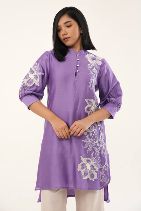 Lilac high low kurta featuring periwinkle garden applique detailing and poet sleeves. Paired with off white straight pants.