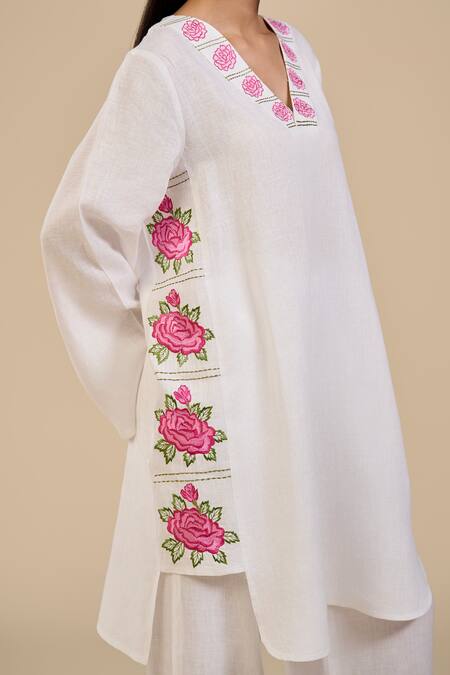 White tunic featuring placement primrose embroidery in pink tones and a V neckline. Paired with matching pants that have embroidered hems.