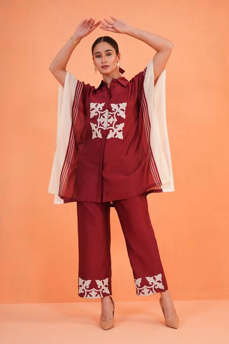 A maroon Chanderi silk kaftan-styled tunic featuring intricate applique and resham embroidery. It is paired with coordinated maroon pants, also adorned with applique work.