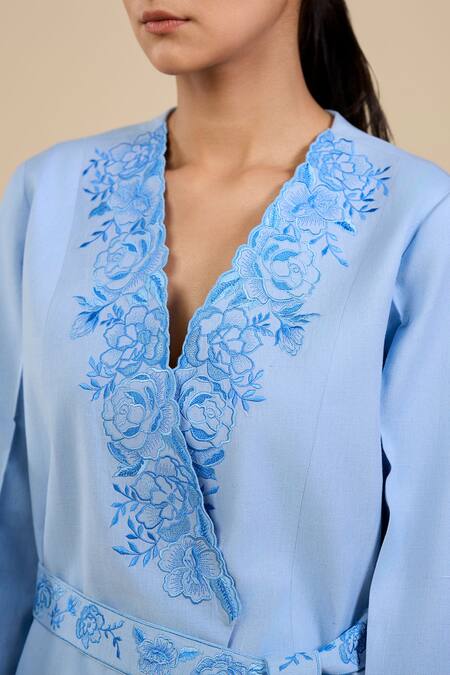 Blue linen blend jacket featuring placement rosette embroidery and a tie-up belt. Paired with flared pants for a coordinated look.
