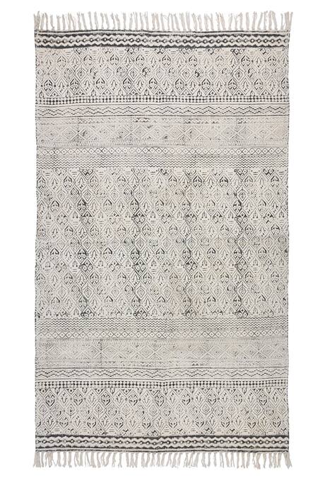 Black hand woven rug with geometric block printed motifs and fringe detail at the ends.