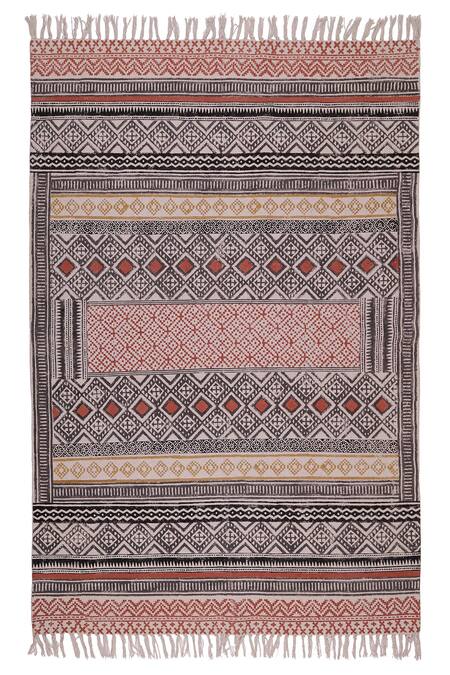 Rust, black hand woven rug with geometric block printed motifs and fringe detail at the ends.