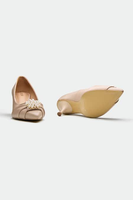 Beige heels featuring a pointed toe design and a decorative pearl embellishment