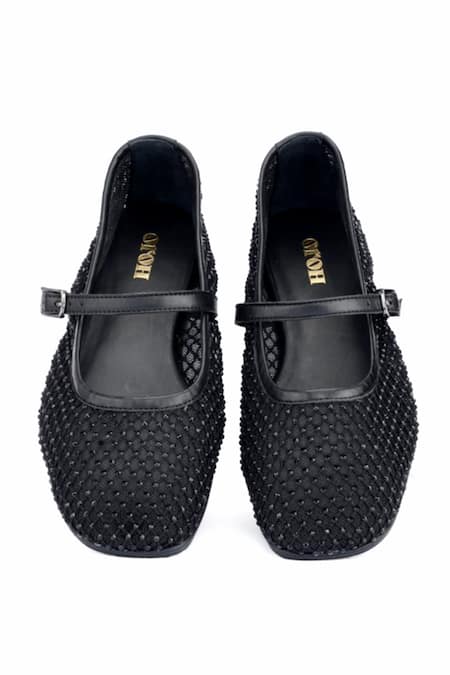 Black mesh ballerina flats featuring crystal embellishments and a secure strap