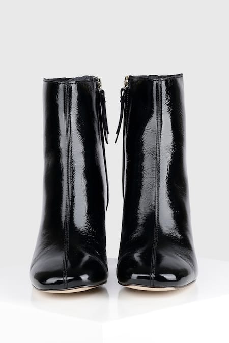 Black ankle boots featuring a closed toe design and piano stitch elastic