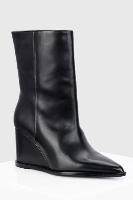 Black wedge ankle boots made from genuine leather featuring a closed pointed toe design