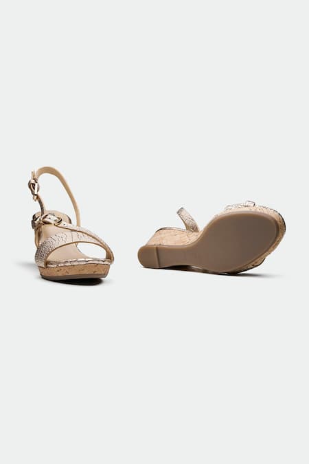 Gold wedge sandals made from genuine leather featuring a cork heel