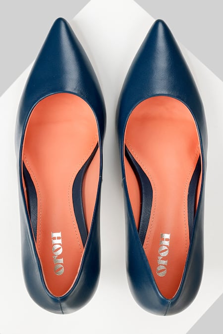 Blue genuine leather pointed toe pumps featuring premium leather lining
