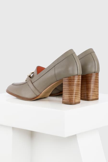 Metal chain loop detailing on the front, Block heel with wood-like finish