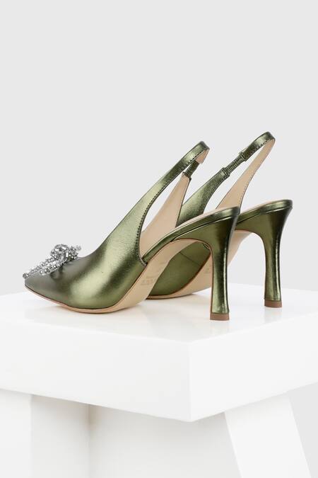 Green pointed toe pump heels featuring a front embellished bow and an elasticated sling back
