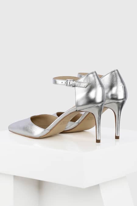 Silver kitten heels featuring a pointed toe and ankle strap design