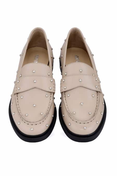 Off white loafers crafted from genuine leather featuring metallic silver stud embellishments