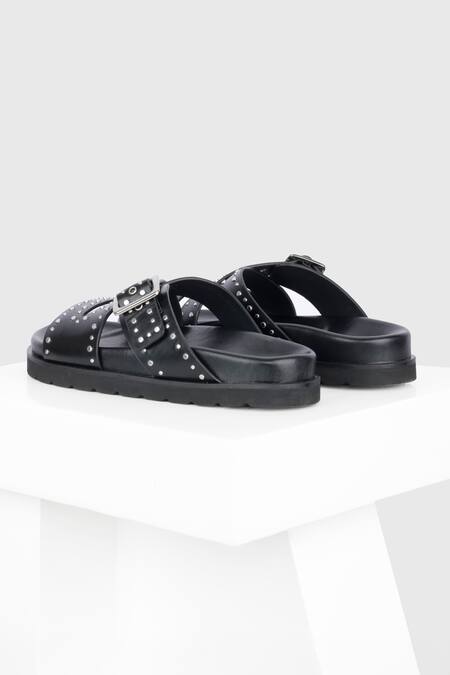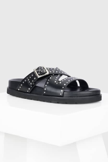 Criss-cross studded straps for added flair, Front open toe design for comfort, Buckle closure for secure fit
