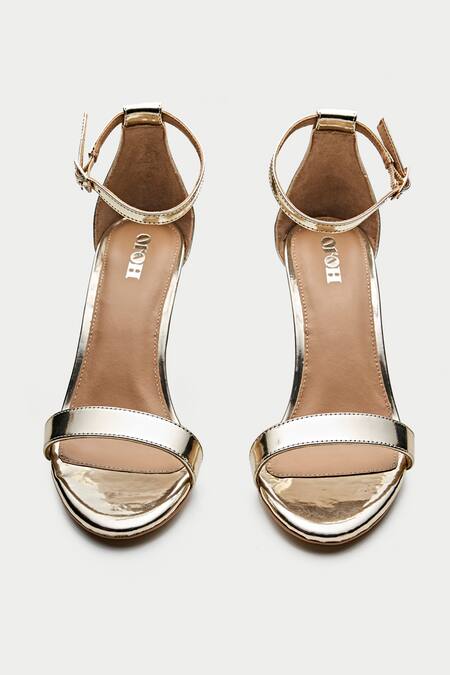 Gold metallic mirror finish heels featuring a front strap and back buckle detailing