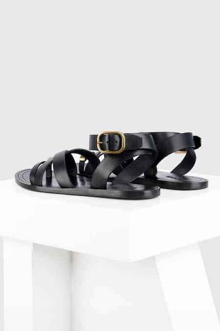 Black flat sandals featuring cross and multi straps with a golden toe ring