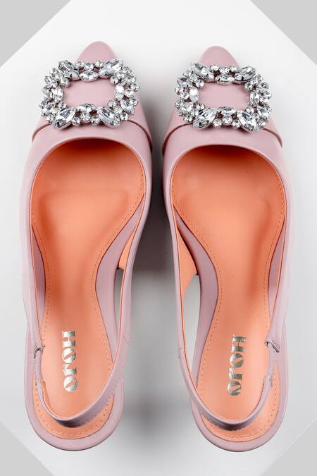 Stone embellished brooch on the front, Semi-elasticated sling-back for comfort