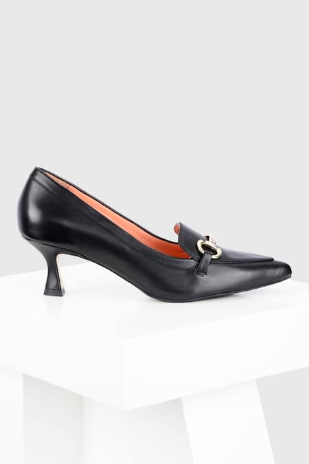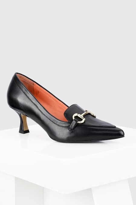 Black leather court shoes featuring an embellished buckle trim detail