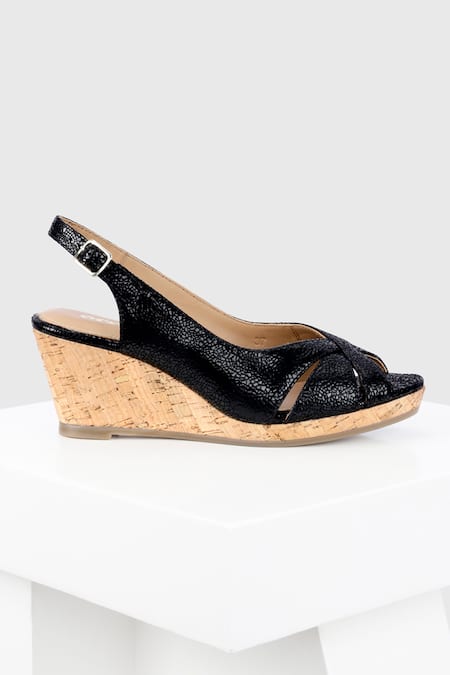 Black cork covered wedges featuring criss cross strap and peep toe detailing