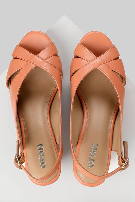 Peach cork covered high heeled wedges featuring leather straps and a front peep toe