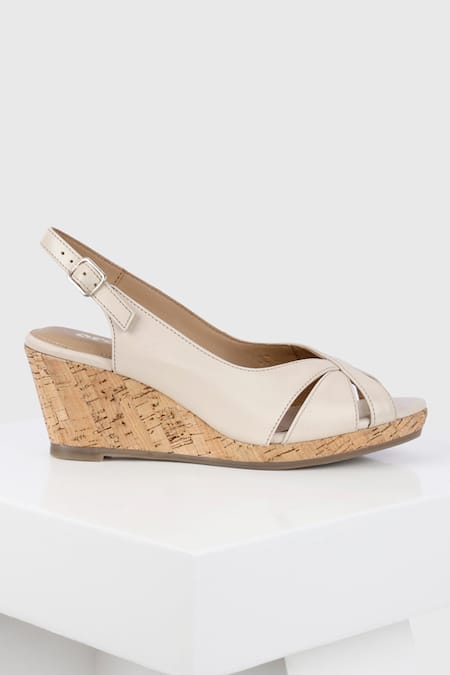 Beige wedges featuring criss cross strap design and peep toe detailing