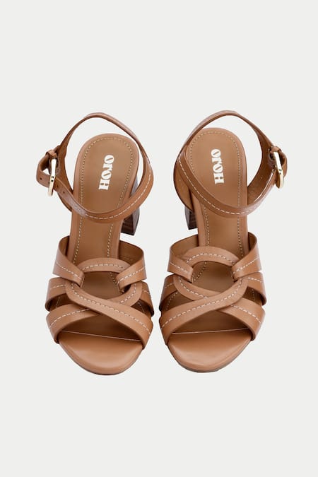 Tan brown block heel sandals featuring criss cross strap detail. Designed with a 2.5-inch heel height for added comfort and style.