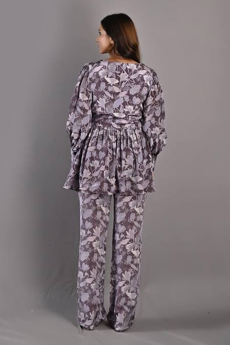 Purple mauve crepe peplum tyle top with floral print, bishop sleeves & pleated empire line. Paired with printed wide pants.