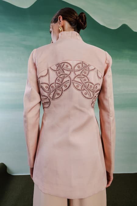 Light pink blazer jacket featuring full sleeves, stand collar, and aari bloom placement embroidery