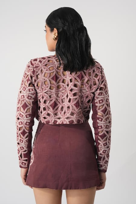 Wine berry cutwork jacket featuring intricate needlework and zardozi work