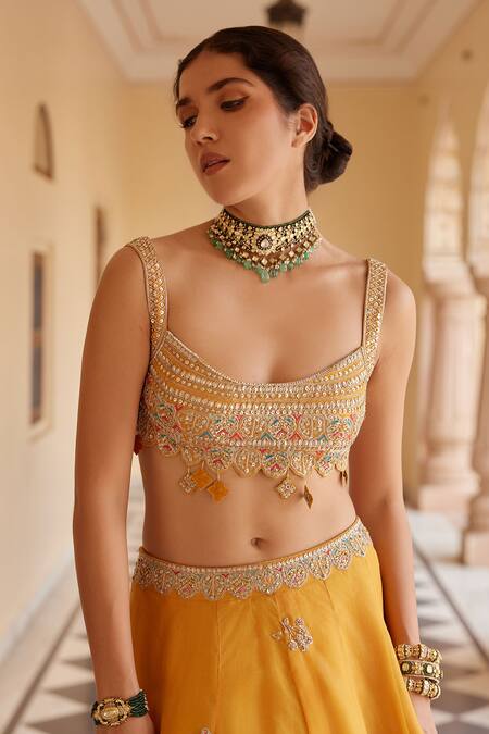Attached cancan for volume, Intricate border embellishments, Backless blouse design