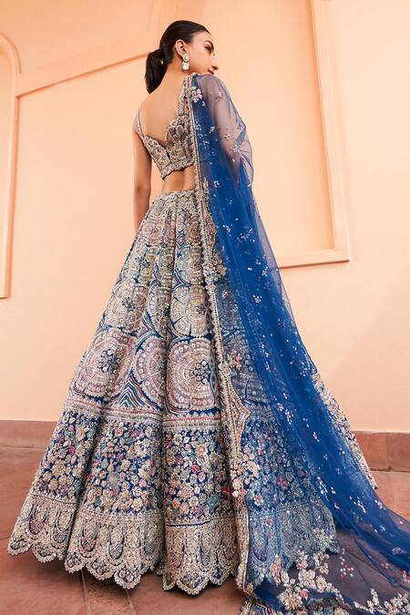 Blue organza lehenga featuring intricate dori, aari, and zardosi embroidery. Paired with a padded blouse and a matching dupatta.