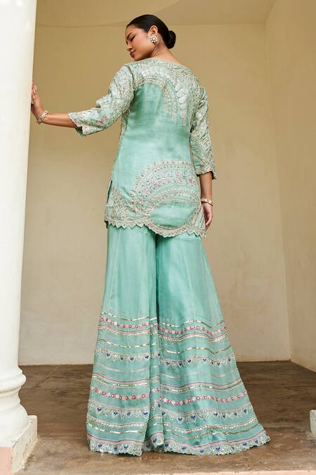 Blue Organza Embroidery, Sequins Round Autumn Leaves Short Kurta Sharara Set