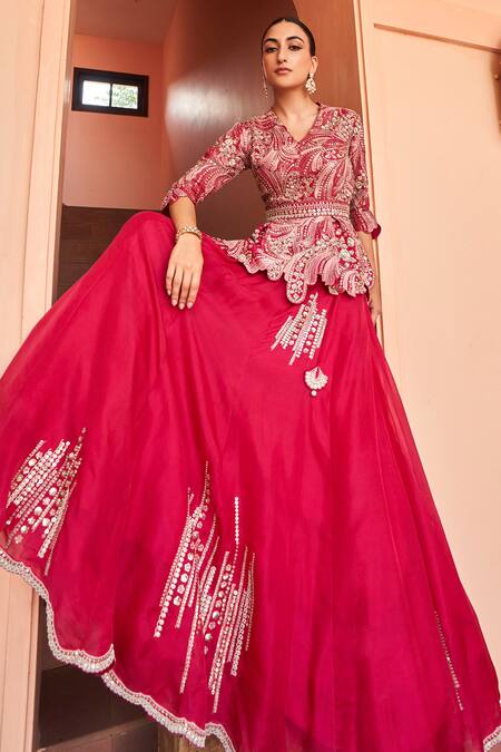 Pink Organza Diamonds, Embroidery, Cut Work V-neck Dori Top And Lehenga Set