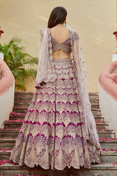Purple Mulberry V Neck Embroidered Bridal Lehenga Set