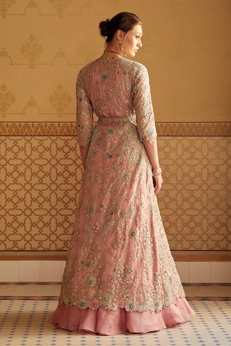 Soft berry long jacket with floral applique work and hand embroidery. Comes with lehenga, blouse and belt.