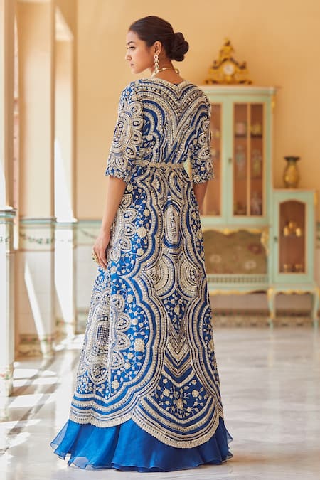 Blue Organza Sequin, Thread And Cutdana Round Embroidered Jacket Lehenga Set