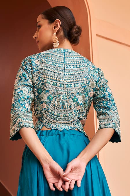 Pine green top featuring floral embroidery with zardozi, aari work, french knots, and dori work. Paired with an asymmetric skirt for a stylish look.