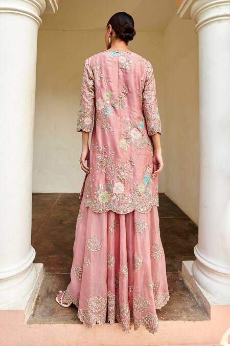 Pink Silk Embroidery Round Neck Floral Vine Zardozi Kurta Sharara Set