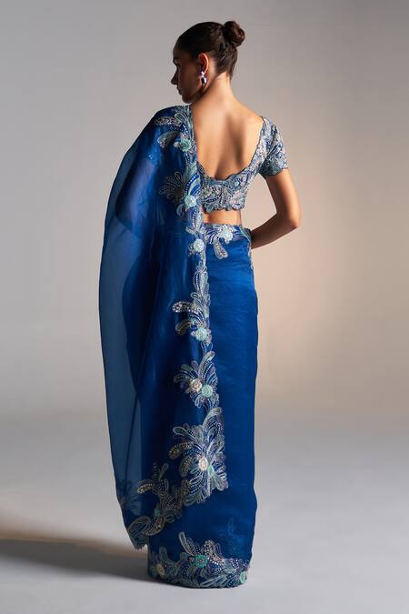 Blue Organza Sequins, Zari, Embroidery Sweetheart Floral Vine Zardozi Saree