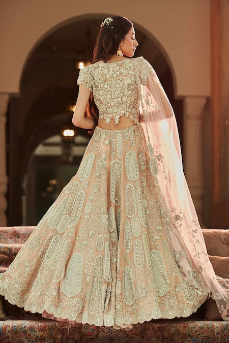 Peach Tissue Kora Leaf Neck Hand Embroidered Bridal Lehenga Set