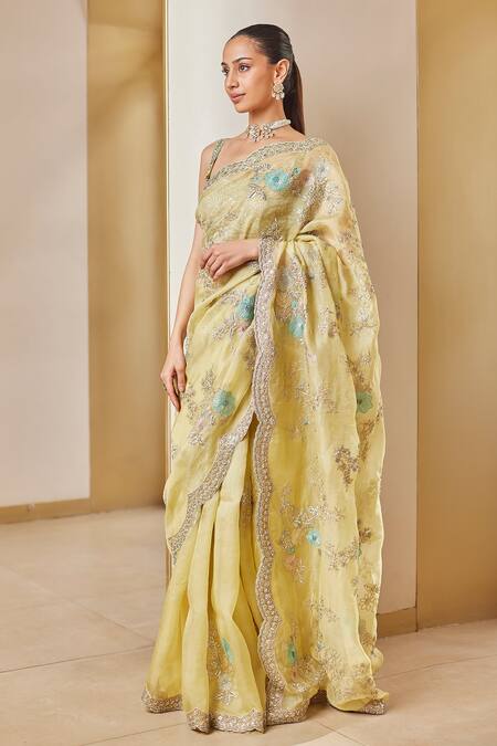 Yellow organza saree featuring scallop trim and hand embroidery with floral vine, french knots, aari, and zardozi. Paired with a matching blouse showcasing all-over hand embroidery and a U neck design.