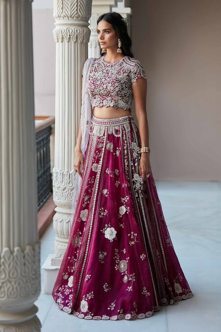 Plum lehenga with floral hand embroidered motifs. Paired with floral embroidered cutwork blouse, embroidered dupatta & embroidered dupatta.