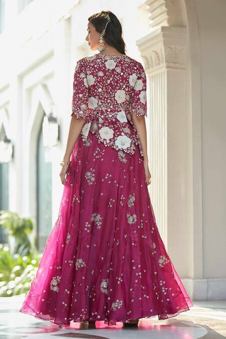 Plum kurta with floral applique hand embroidered motifs & cutwork border. Paired with organza silk floral embroidered lehenga.