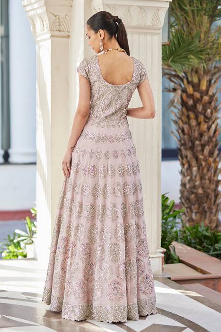Lavender silk anarkali featuring aari, zardozi, and french knots embroidery in a geometric pattern. Paired with a sheer embroidered dupatta.